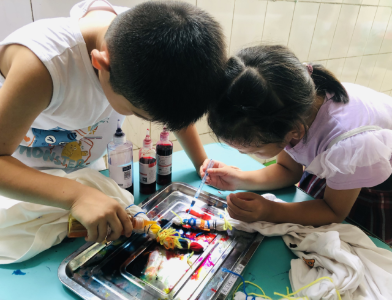 在芙蓉科艺幼儿园,老师们围绕扎染工艺的基本知识和具体操作方法进行讲解,引导孩子们为爸爸扎染一件T恤衫。