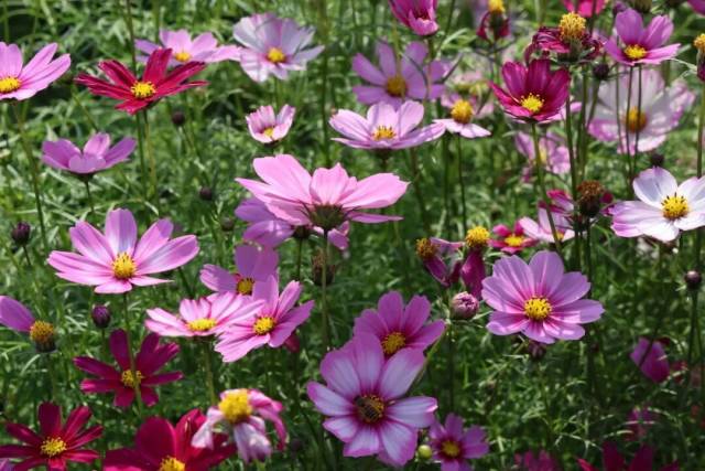 此时此刻,连片的格桑花沿着田埂肆意铺展,顺着坡地自然漫开,粉的似锦绣朝霞,白的如飘落云絮,紫的闪光宝石,细瘦的茎秆顶着轻盈的花盘,在微风中轻轻摇曳,泛起层层温柔的花浪。