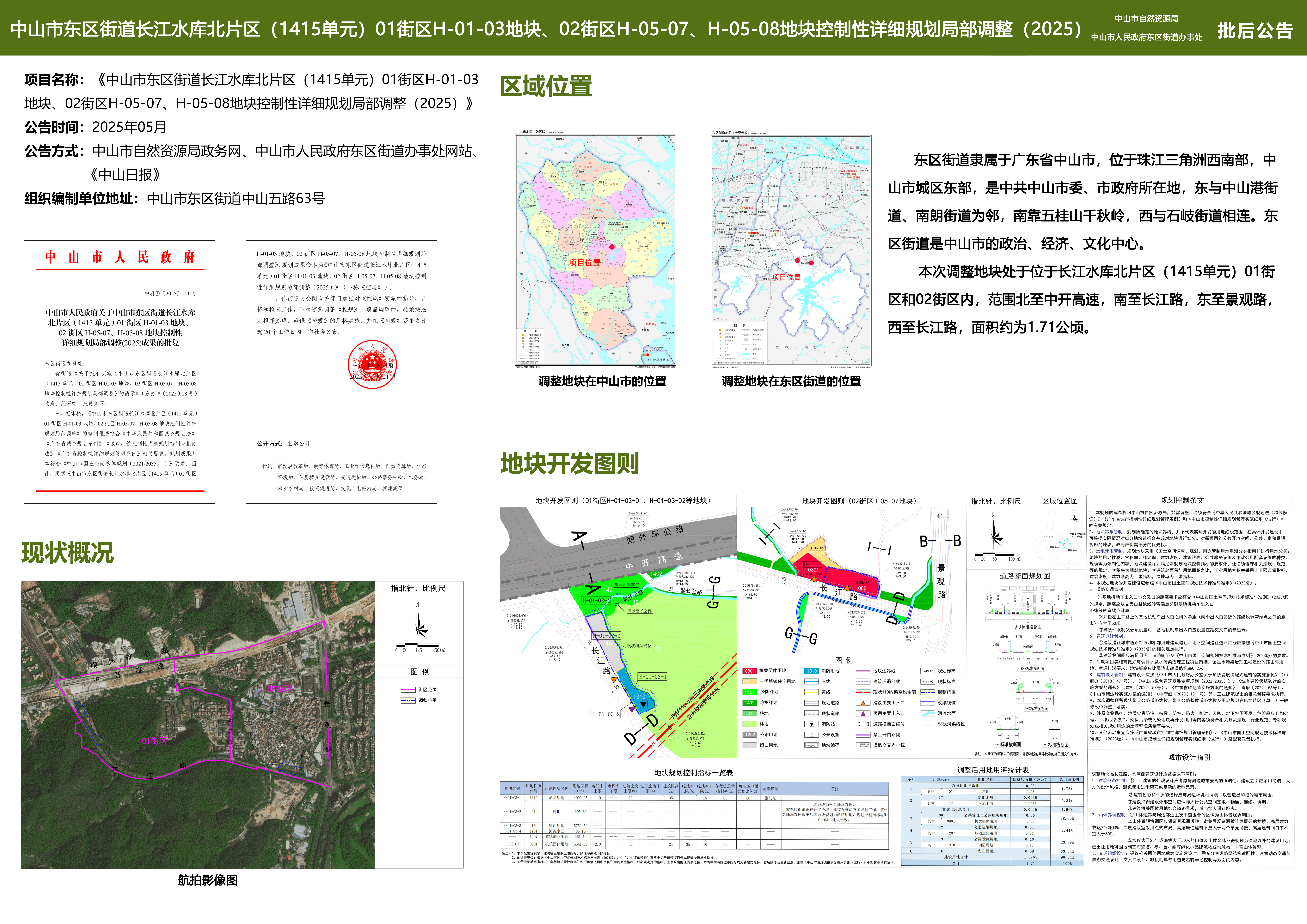 附件:《中山市东区街道长江水库北片区(1415单元)01街区H-01-03地块、02街区H-05-07、H-05-08地块控制性详细规划局部调整(2025)》批后公告板
