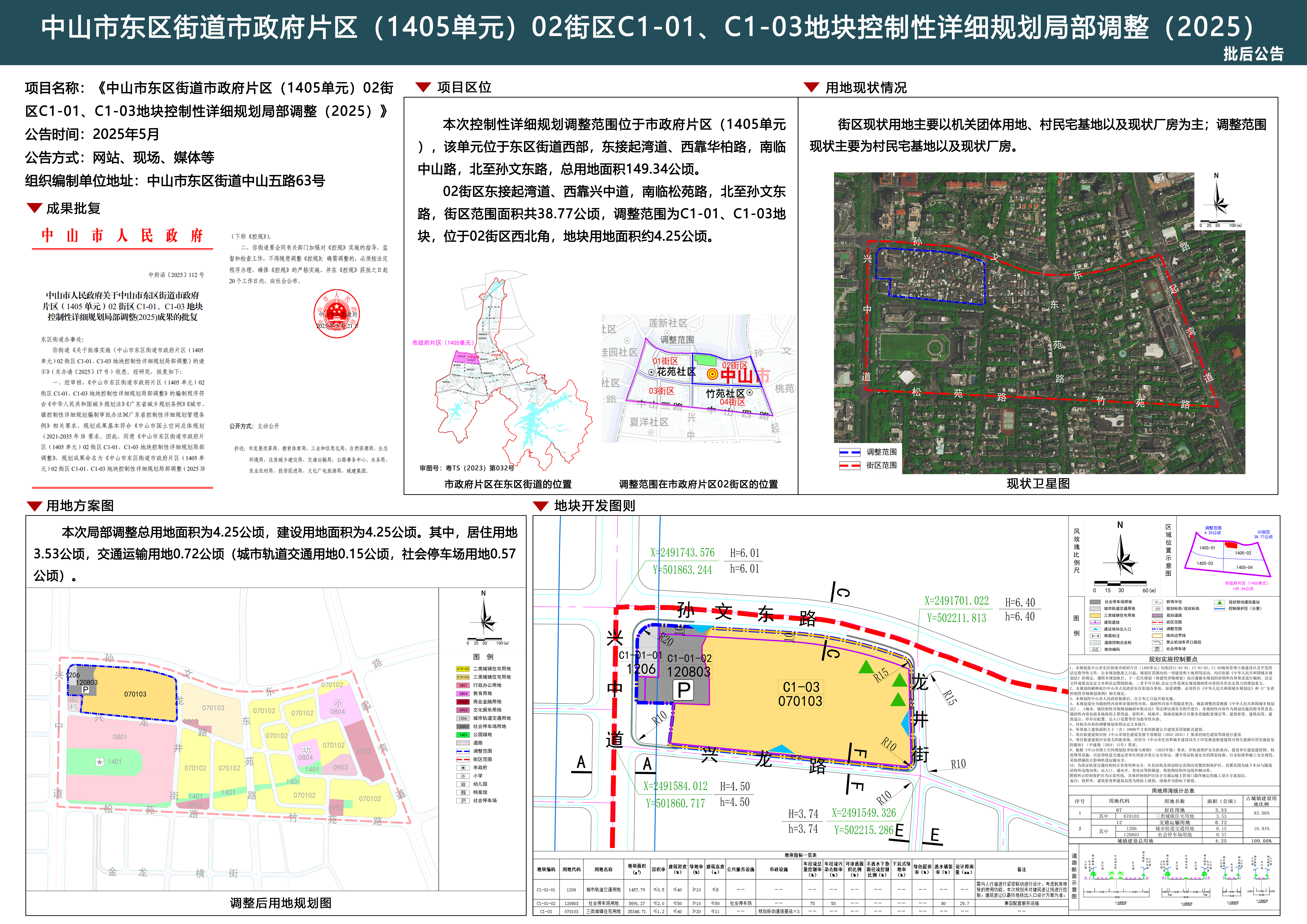 《中山市东区街道市政府片区(1405单元)02街区C1-01、C1-03地块控制性详细规划局部调整(2025)》批后公告板