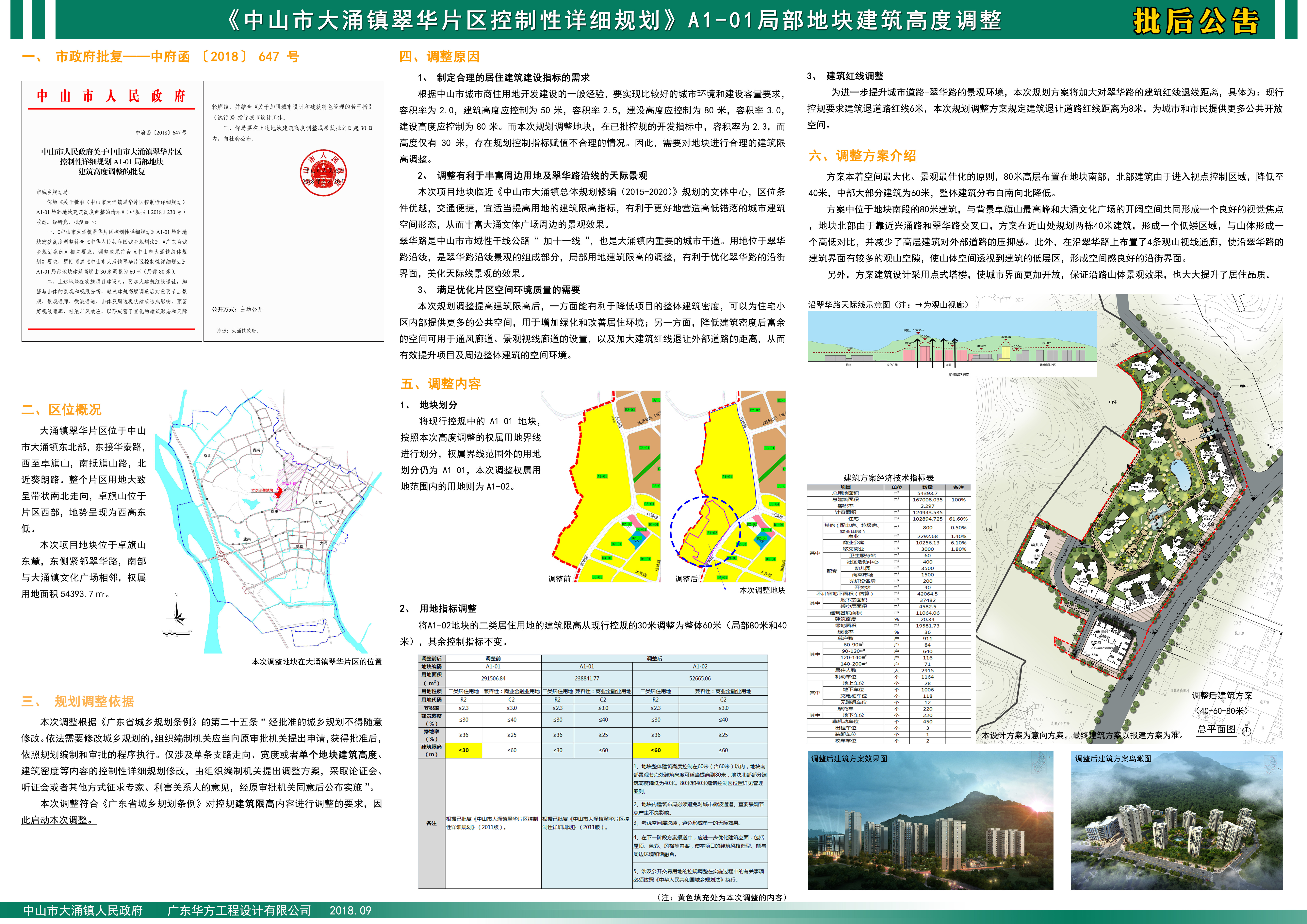 《中山市大涌镇翠华片区控制性详细规划》A1-01局部地块建筑高度调整成果,业经中山市人民政府审批通过,自批准之日起实施,现根据《中华人民共和国城乡规划法》等相关法律、法规要求予以批后公布,广大市民可到大涌镇行政服务中心或登录镇政府网站查阅相关情况。