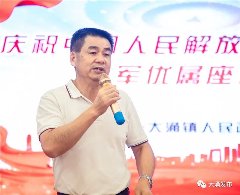 大涌镇党委副书记、镇长贺修虎,镇人大主席林雅科,镇党委委员、副镇长梁俊辉,镇工商联(商会)主席萧志豪以及退役军人代表、现役军人家属代表约50余人欢聚一堂,热烈庆祝中国人民解放军建军93周年。