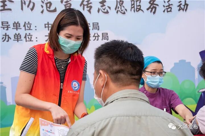 志愿者们在大涌医院急诊大楼前设立服务咨询台,向来往群众、看病患者提供便民咨询服务、法律法规宣传,并向周边街道群众派发防医托反诈骗安全防范传单,宣传反诈防骗知识。
