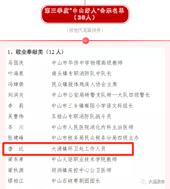 2020年第三季度“中山好人”名单 11月4日公布 大涌镇环卫处工作人员唐达 入选“敬业奉献类”好人