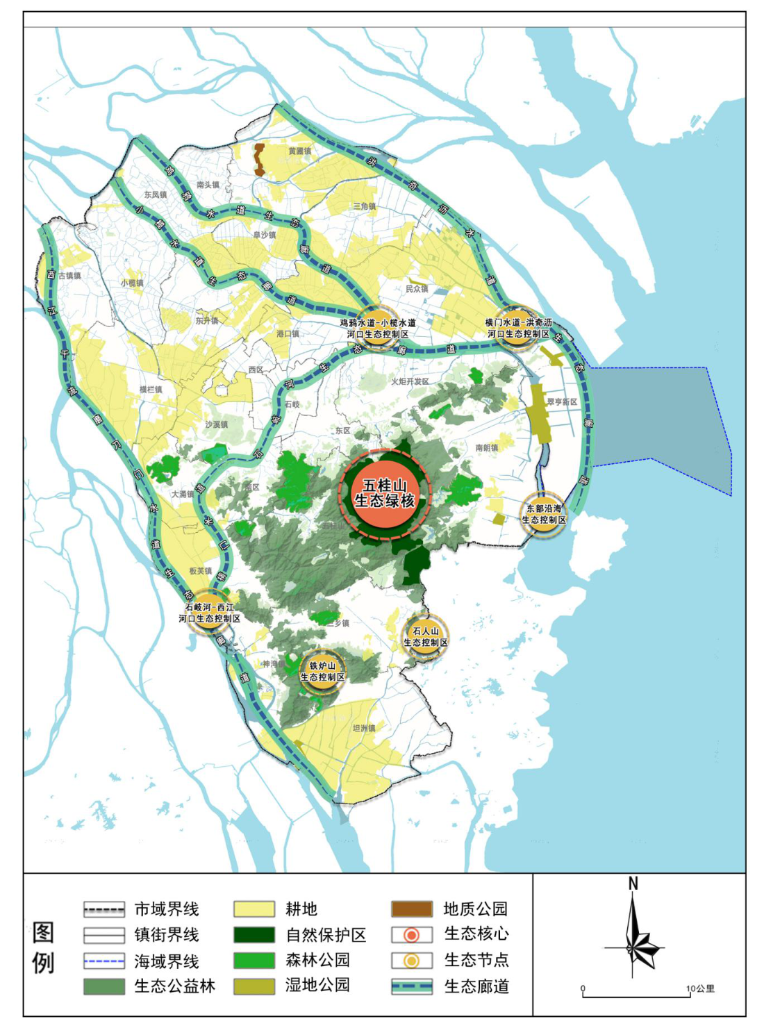 图5 中山市“一核、五廊、六区”生态安全战略格局示意图