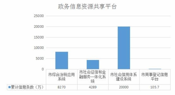 截至2018年12月31日,政务信息资源共享平台共交换数据48.87亿条次,其中2018年1月至12月交换量达19.09亿条次,日均交换数据量约192.5万条次,累计数据容量达5.3T。该政务资源共享体系着力支撑网上办事大厅中山分厅、市综合治税应用系统(收集数据累计约8270多万条)、市社会征信和金融服务一体化系统(收集数据累计约4289多万条)、市社会信用体系建设系统(收集数据累计约2亿条)、市商事登记信息平台(收集数据累计约105.7万条)、市残疾人就业保障金系统、经济运行分析与行政执法等重点政务信息化系统建设,获得良好的经济和社会效益。