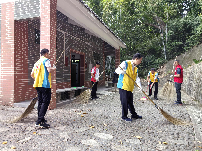 翠亨集团和党群服务中心志愿者在清理落叶和泥土