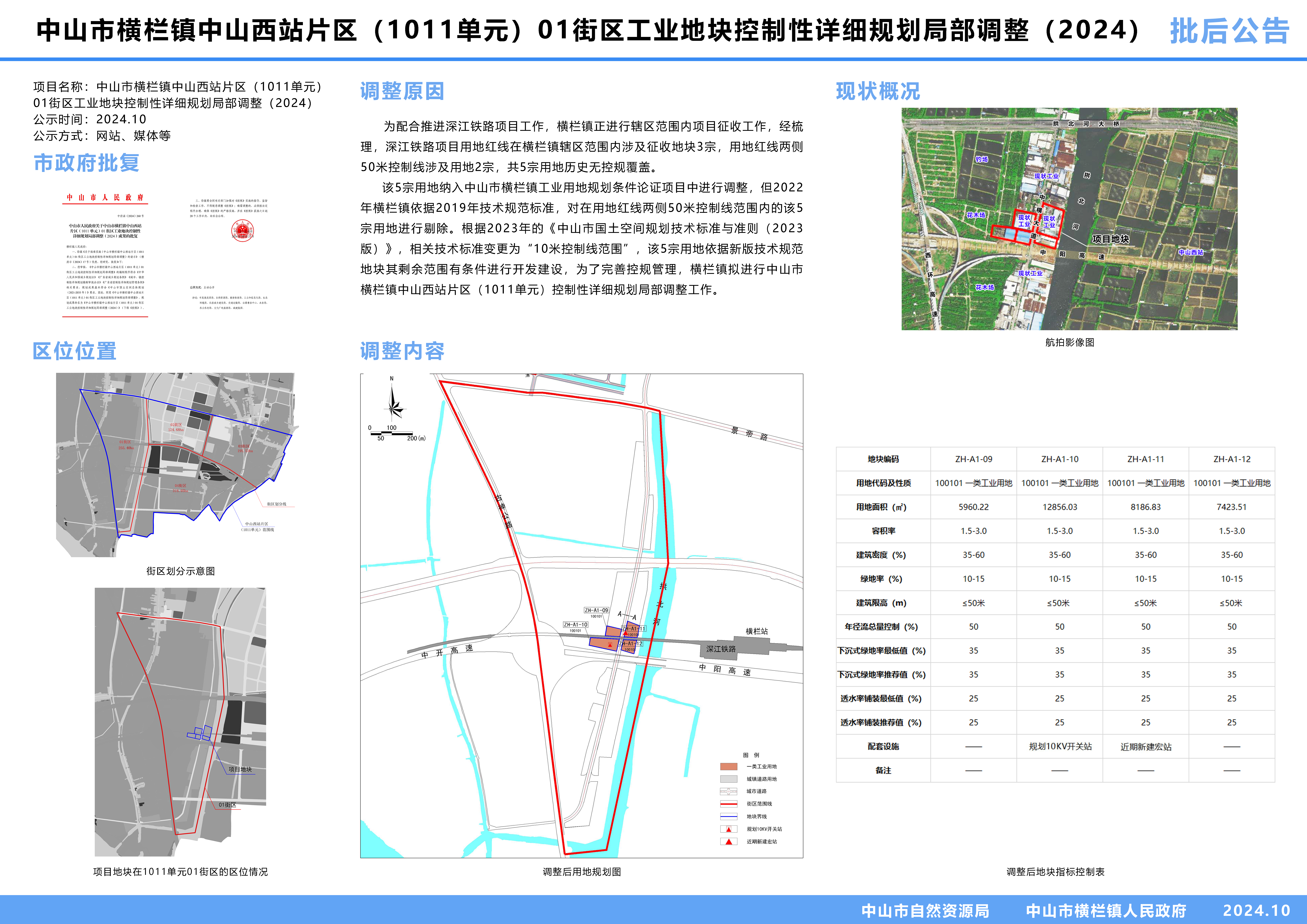 附件:中山市横栏镇中山西站片区(1011单元)01街区工业地块控制性详细规划局部调整(2024)批后公告