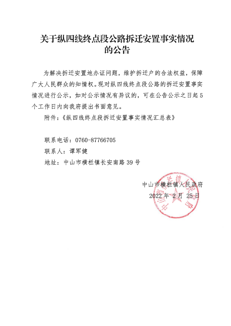 关于纵四线终点段拆迁安置事实情况的公告