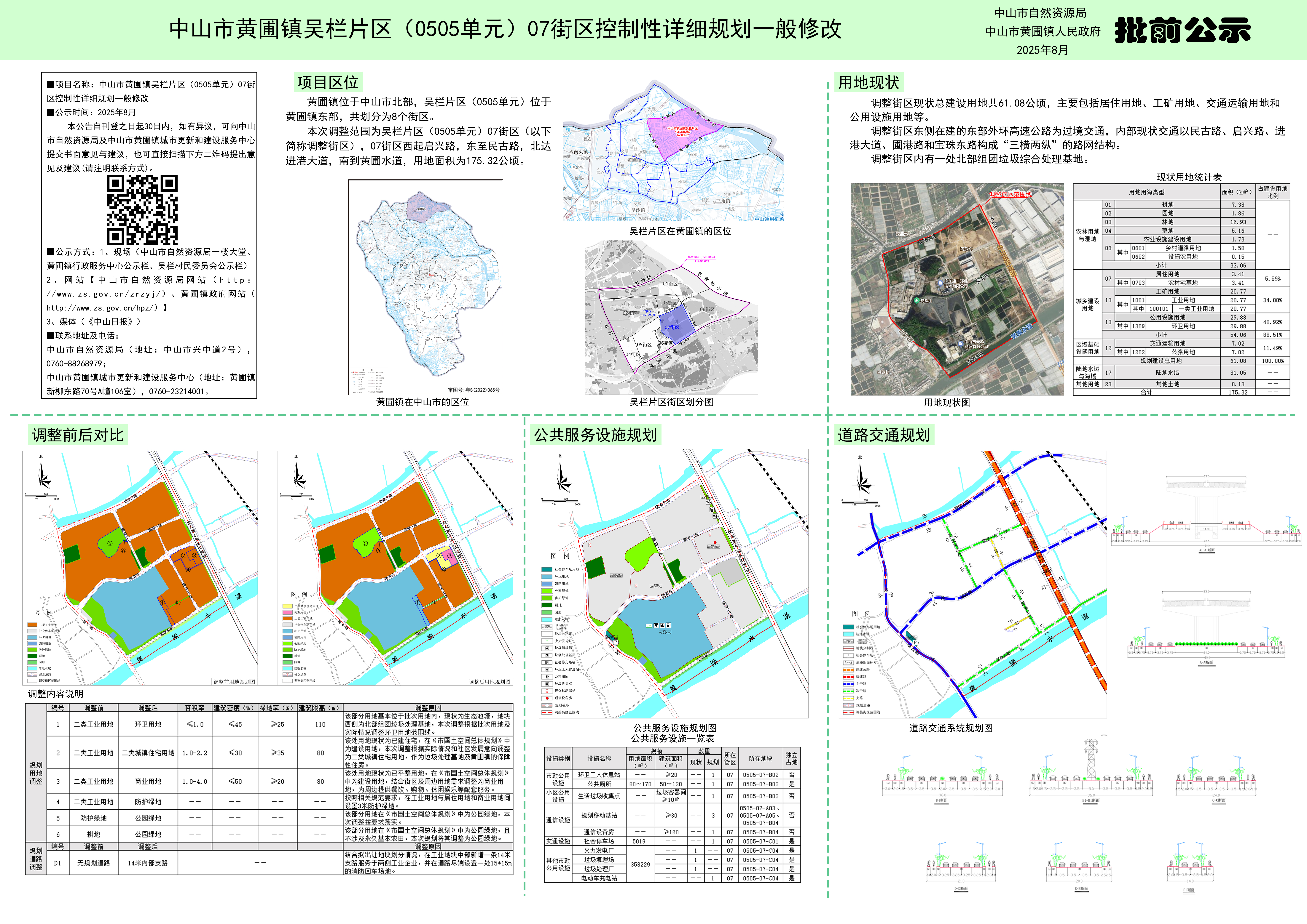 我镇《中山市黄圃镇吴栏片区(0505单元)07街区控制性详细规划一般修改》草案已编制完成,现根据《中华人民共和国城乡规划法》等法律法规要求,对该草案予以公示。