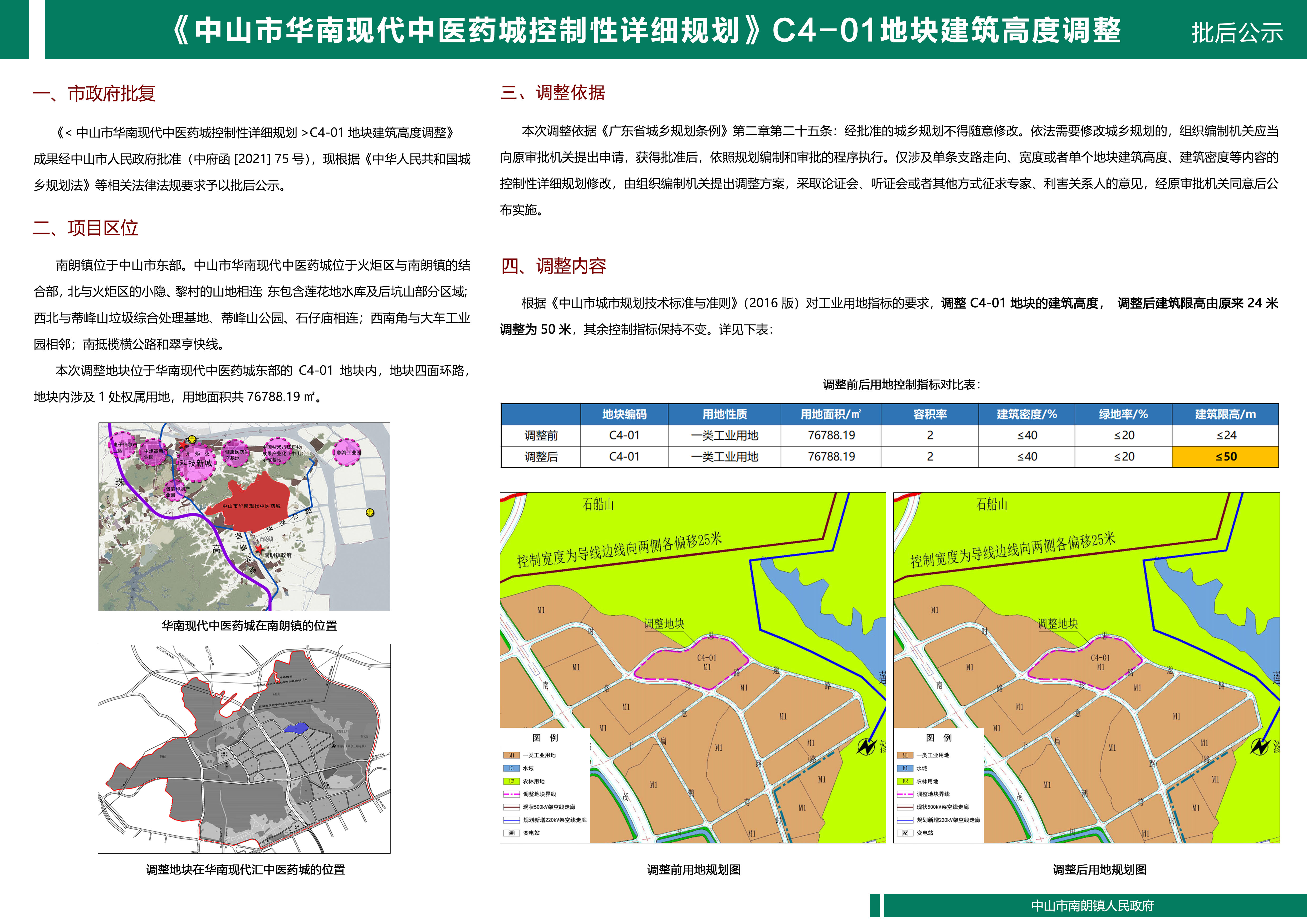 关于公布实施《中山市华南现代中医药城控制性详细规划》C4-01地块建筑高度调整成果的公告