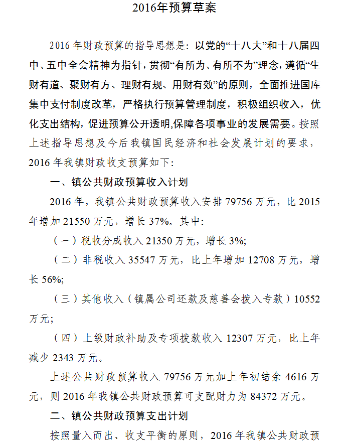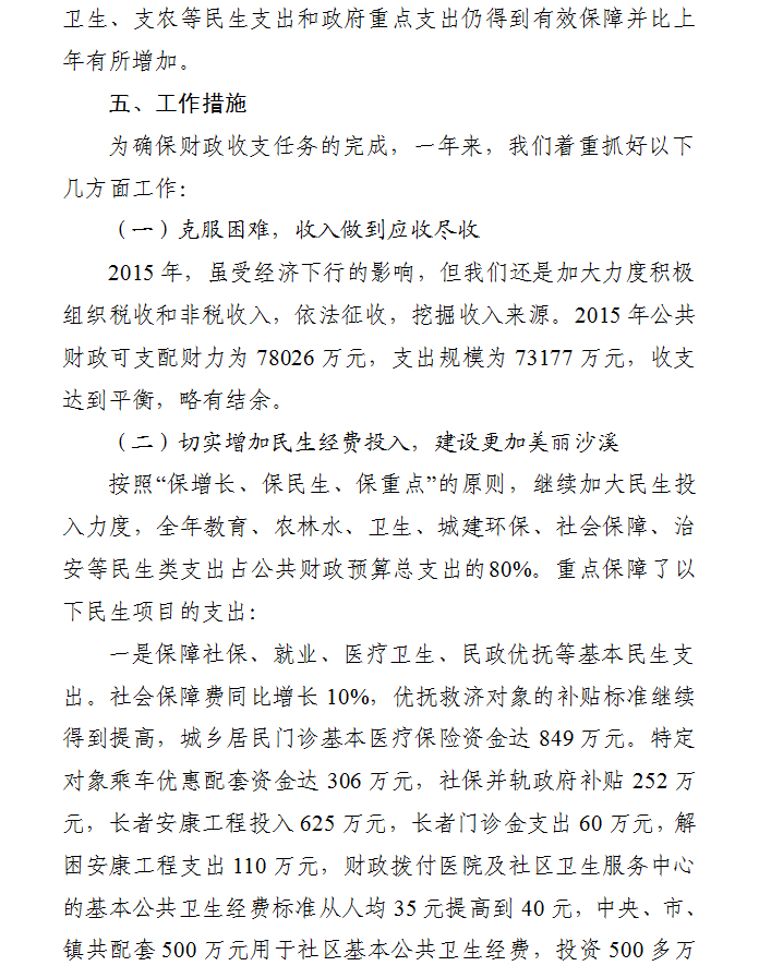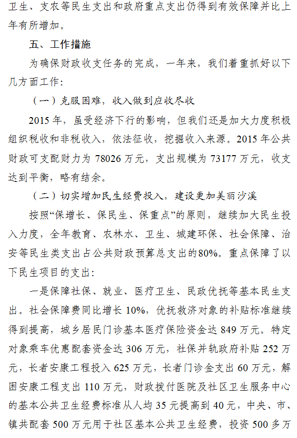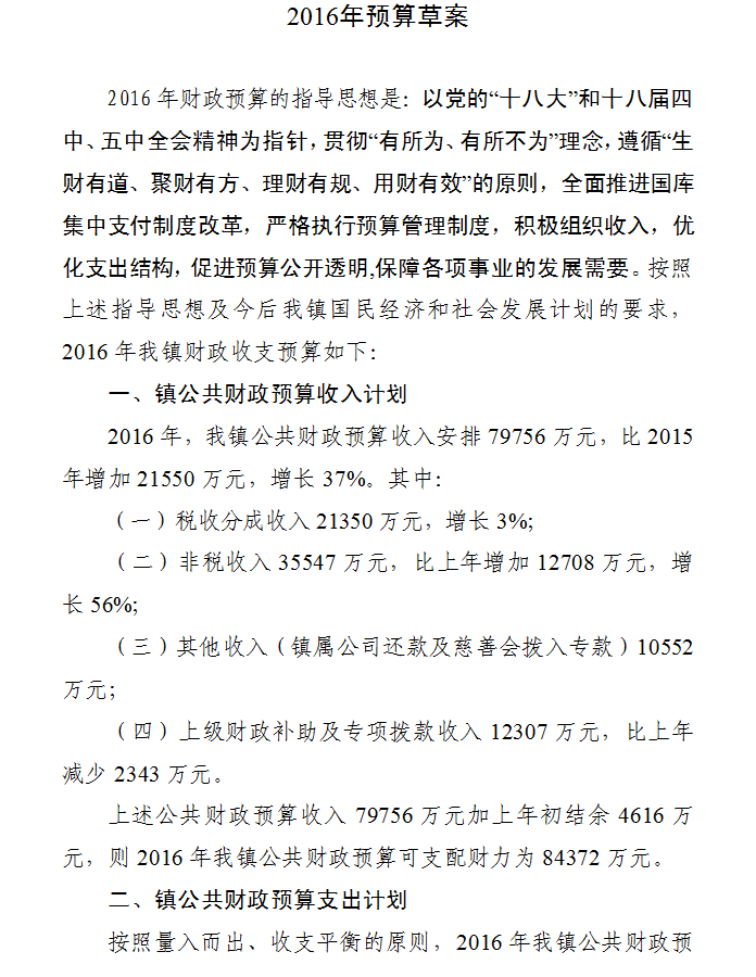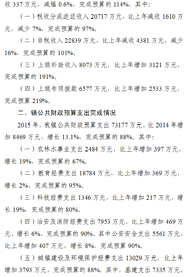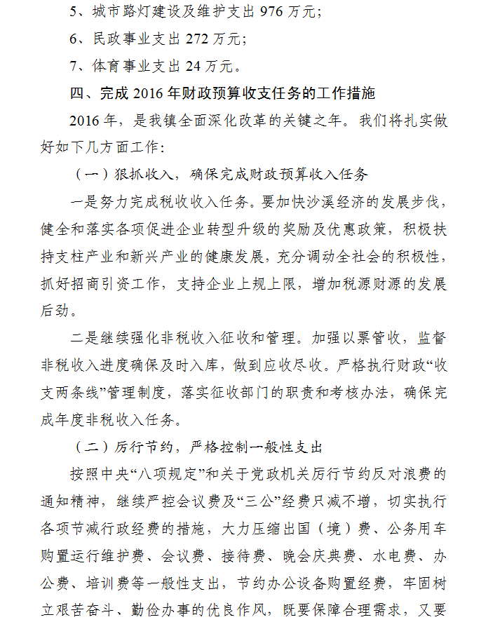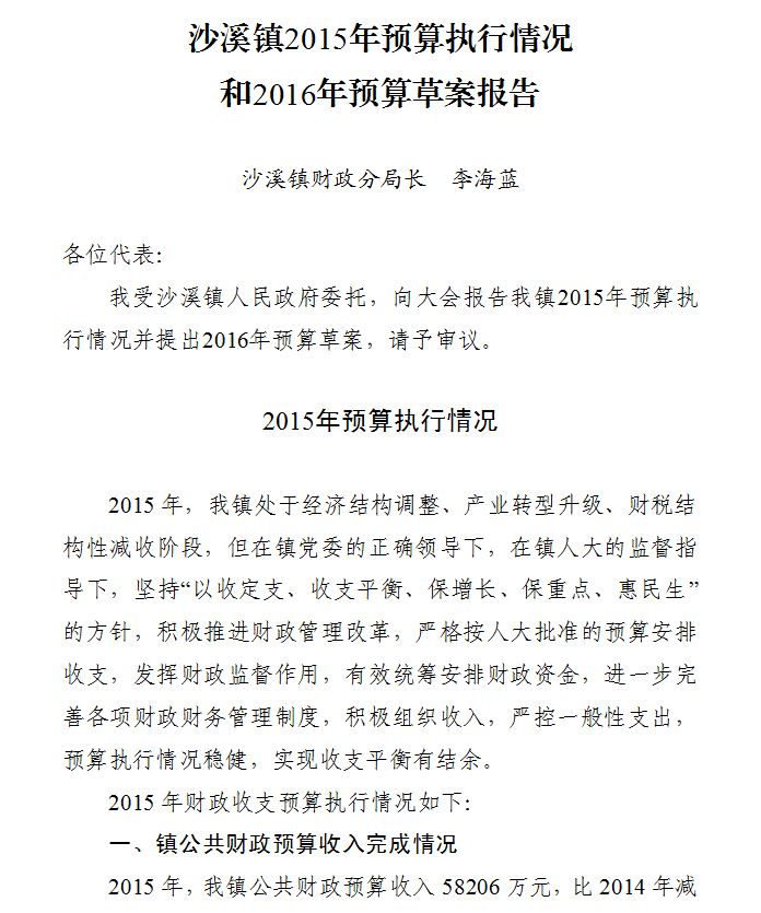 沙溪镇2015年预算执行情况和2016人大预算草案报告