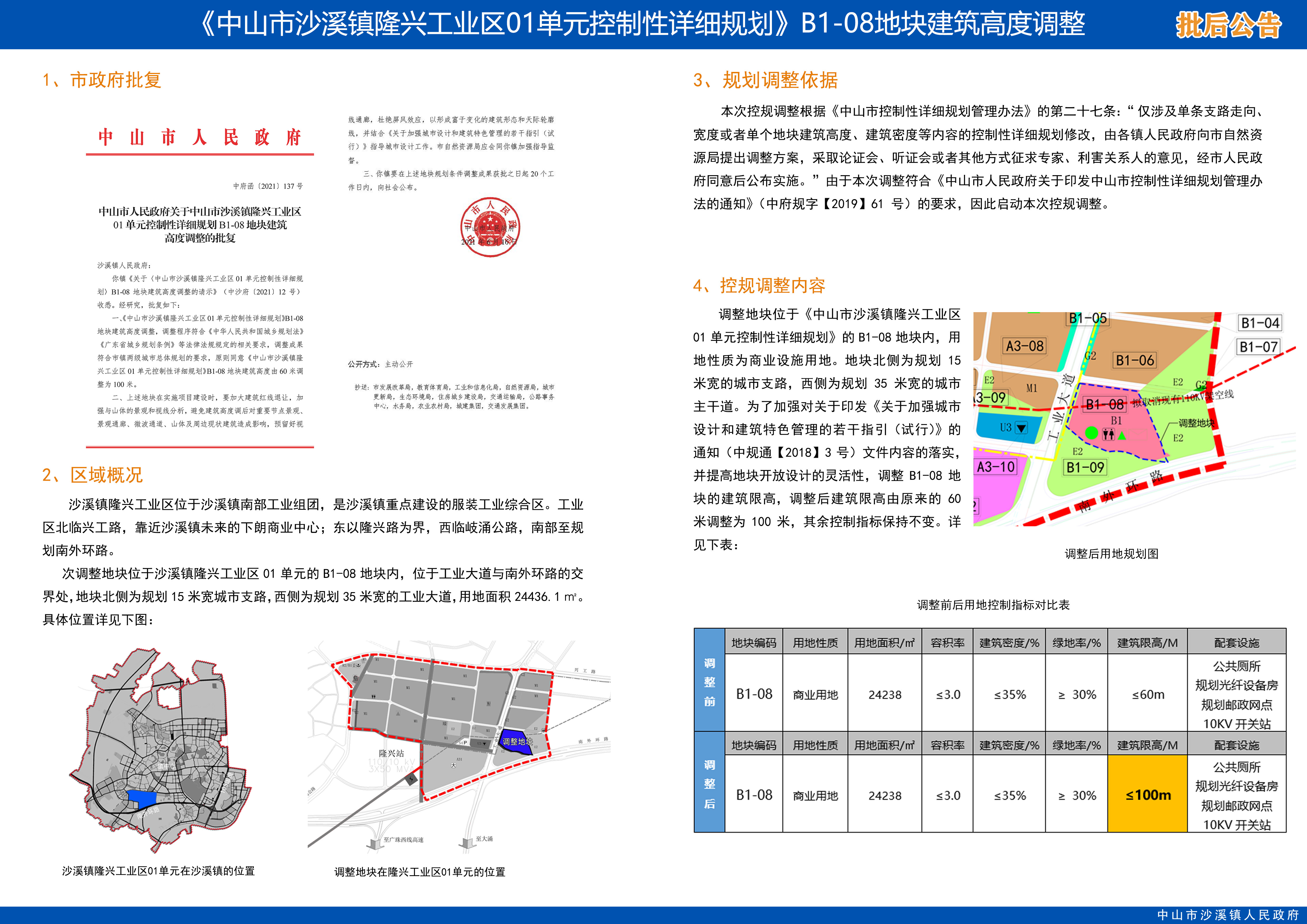 《中山市沙溪镇隆兴工业区01单元控制性详细规划》B1-08地块建筑高度调整,业经中山市人民政府审批通过,自批准之日起实施。现根据《中华人民共和国城乡规划法》等相关法律、法规要求予以批后公布,有关调整成果内容可在《中山日报》、中山市自然资源局网站(http://www.zs.gov.cn/zrzyj/)、沙溪镇政府网站(http://www.zs.gov.cn/shxz)查阅。