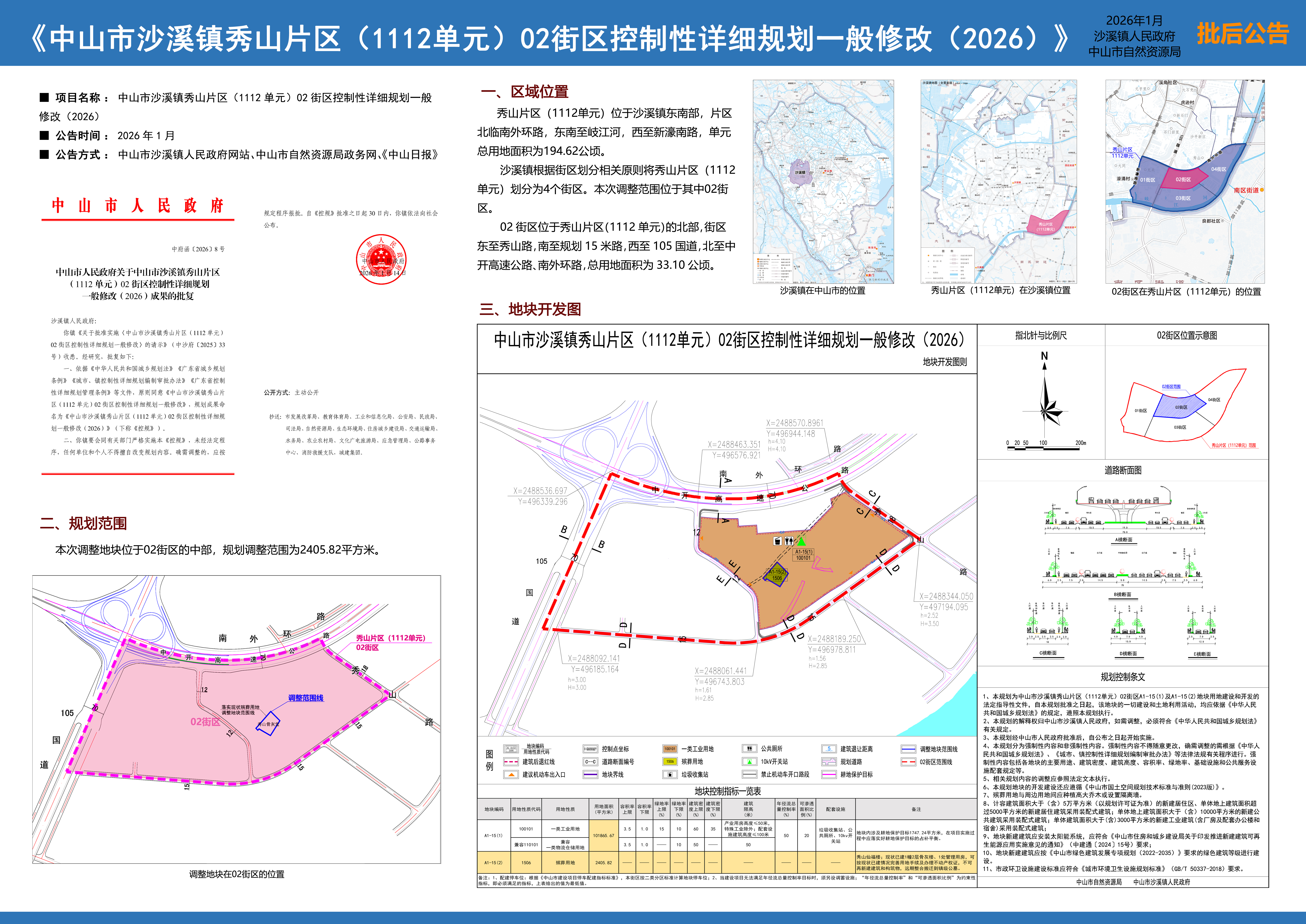 附件5:《中山市沙溪镇秀山片区(1112单元)02街区控制性详细规划一般修改(2026)》批后公告