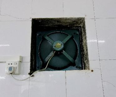 ▶操作区内灶台上方固定抽油烟的墙壁,有油烟污垢未清洗干净。