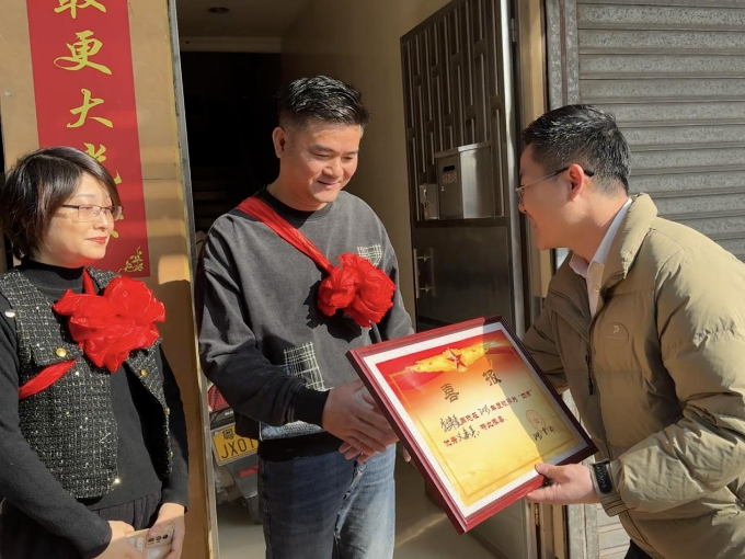 新年伊始,喜报频传。近日,沙溪镇陆续收到多份立功受奖喜报,目前已收悉10位现役军人荣获2025年度“四有”优秀士兵(军官)。为弘扬拥军优属光荣传统,营造“一人参军、全家光荣”的浓厚氛围,自1月6日起,沙溪镇党委、政府领导率领退役军人服务中心、武装部及各村(社区)负责人组成慰问组,分批登门为优秀士兵家属送上满载荣誉的喜报和新春祝福。
