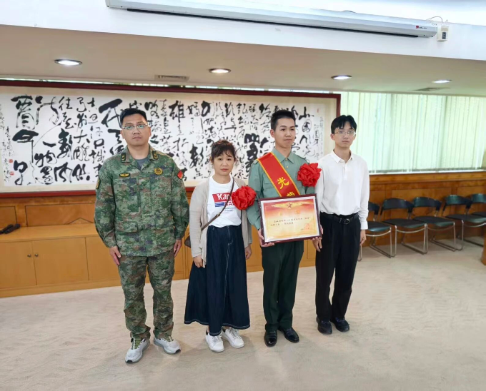 会议宣读2026年春季退役军人立功受奖情况,刘锦荣为退役军人梁浩楠及其家属现场致送“四有”优秀士兵喜报。