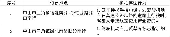 为进一步维护道路交通秩序,预防和减少交通事故的发生,交警部门在中山市三角镇福源南路-沙栏西路路口南行、中山市三角镇岗北南路路段南行等路段增设了2处固定式交通技术监控设备。按照《中华人民共和国行政处罚法》《中华人民共和国道路交通安全法》和《道路交通安全违法行为处理程序规定》等有关法律法规要求,现将设置地点向社会公布(详见附表)。