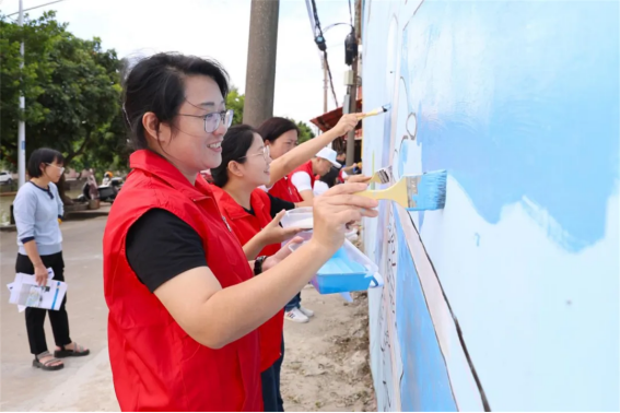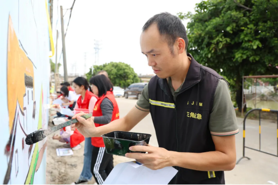 彩绘过程中,尽管烈日炎炎,大家分工协作,默契配合,全神贯注地投入到创作中,每一笔每一划都倾注着对三角美丽乡村的热爱。