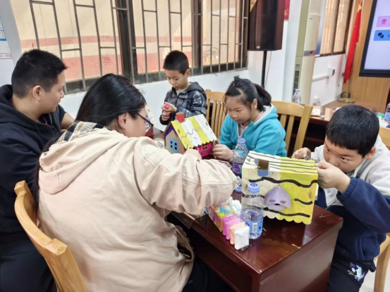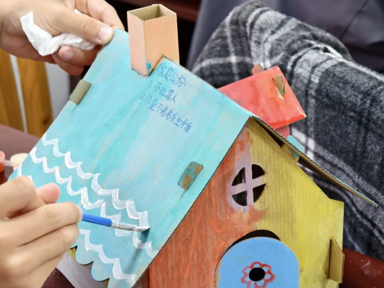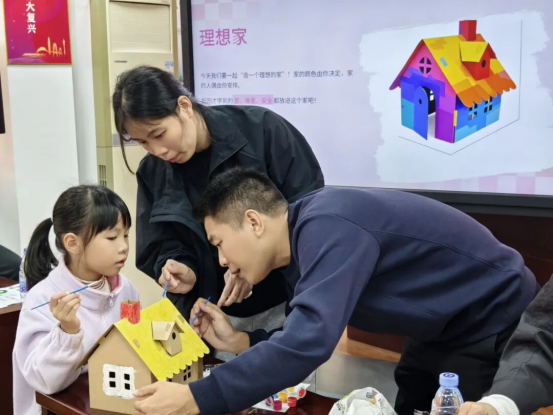 各家庭围坐共议,制定专属家庭零暴力“公约”,从“不吼叫”到“多拥抱”,每一条款均是爱与尊重的承诺。随后,亲子合作搭建“爱的小屋”模型,将公约理念具象化,打造象征和平与幸福的“理想之家”。