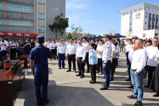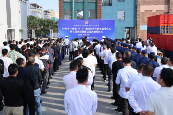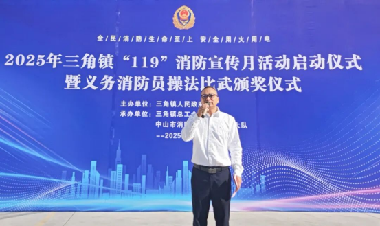 随后,郑凯宏宣布:“三角镇2025年‘119消防宣传月’正式开始!”伴随着热烈的掌声,以“全民消防,生命至上——安全用火用电”为主题的消防宣传月系列活动正式全面启动。