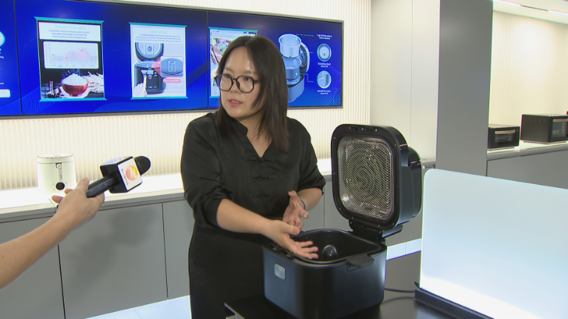 广东伊莱特电器有限公司国际营销事业部销售总监郝丽丽:“像里面这个底部,我们有底部的加热,可以直接当做一个电饭煲用,然后在顶部的加热,也可以作为一个空气炸锅,因为现在大家的厨房比较小,像这种产品是比较实用的。”