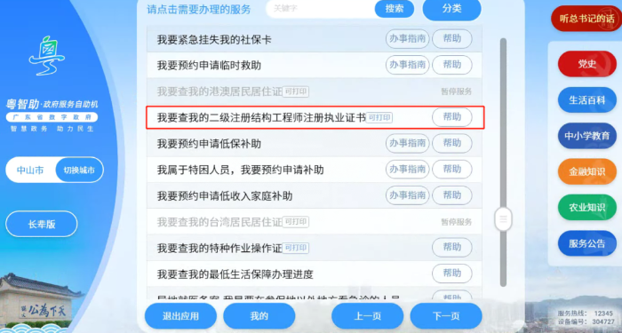 第一步:进入“粤智助”界面,下拉或搜索找到【我要查我的二级注册结构工程师注册执业证书】,点击进入。