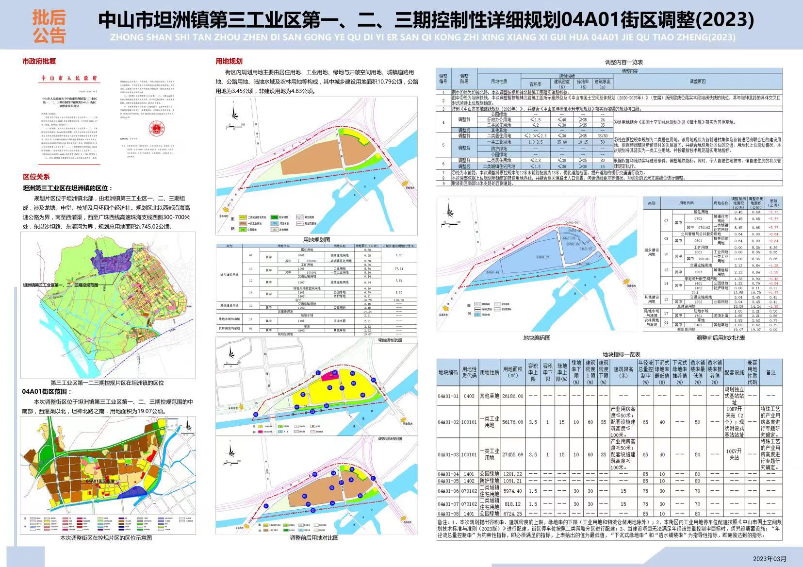 《中山市坦洲镇第三工业区第一、二、三期控制性详细规划04A01街区调整》已于2023年3月7日经中山市人民政府批准,批复文号中府函〔2023〕43号。根据《中华人民共和国城乡规划法》《广东省城乡规划条例》等相关法律、法规要求予以批后公布。有关规划成果信息可在市自然资源局网站和坦洲镇人民政府网站查询。