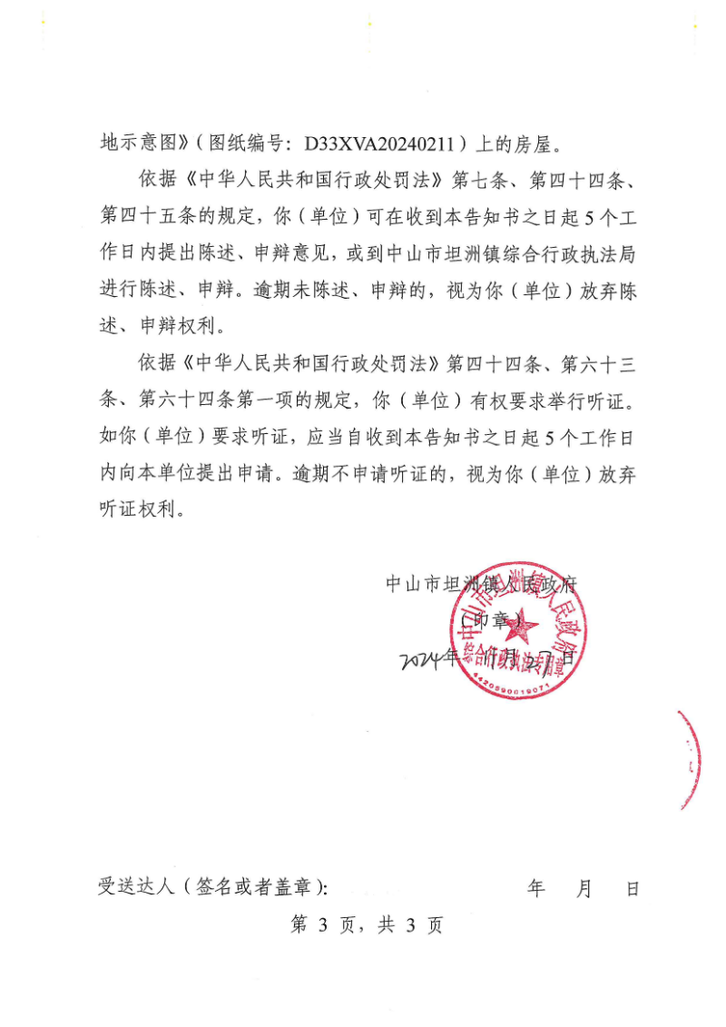 附件:《中山市坦洲镇人民政府行政处罚听证告知书》(粤中坦洲执罚听告〔2024〕1160号)