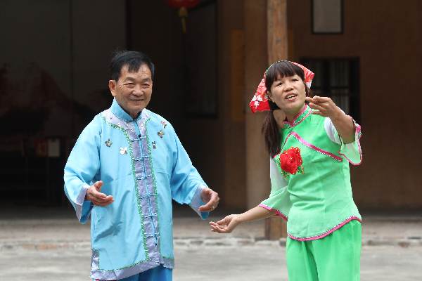 白口莲山歌传承人刘永荣为徒弟讲解白口莲山歌的演唱技巧