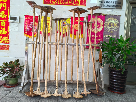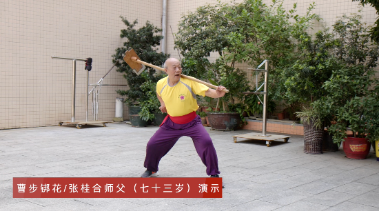䦁是珠江三角洲常用的一种农具,曹步䦁花源自洪家拳锄头技法套路,当地村民在日常生活生产中进行改良,加入打花的动作,将套路名称改为“舞䦁花”。曹步䦁花的套路共六十四式,主要特征为气势凌厉、步伐稳健、攻防兼备、技法全面,套路工整大方,既突出了技击的实用性,又兼顾了表演的可观性。