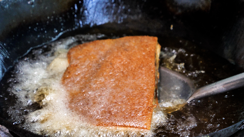 油炸:将五花腩肉皮面朝下,入锅油炸,油温控制到一百八十度至两百度,表皮油脂在高温中大量溶解