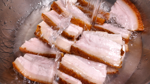 冲漂:将浸漂后的猪肉切成均匀大小一件件的扣肉形状,再用良都古井的山泉水冲漂,冲去多余的油脂