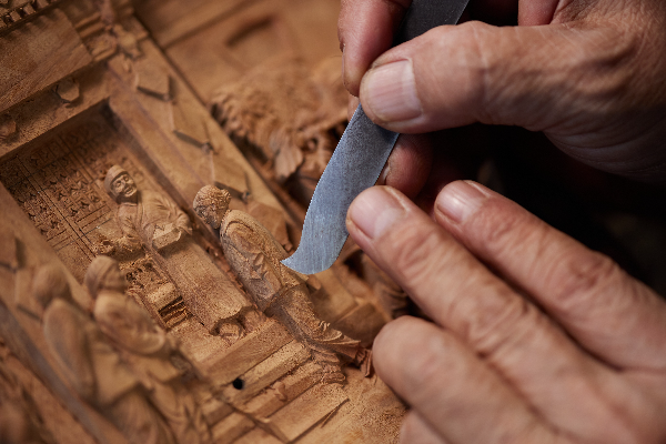 大涌高浮雕起源于唐宋时期,明清时期蓬勃发展,清末民初在继承中国古典风味的同时,吸纳了东南亚、南美洲的雕刻技艺和木材选料。木雕(大涌高浮雕)以黄杨木、柚木、花梨木等为原材料,主要通过刻技法,经开料、加工设计、凿粗胚、修细、打磨、抛光、上漆等工序加工创作成各类工艺品。构图上注重运用中国绘画的散点透视法,使物象高低错落有致,空间层次分明,形成雅致大方、富含古典韵味的风格。