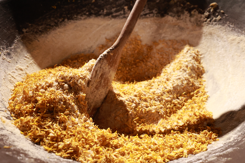 通过离火翻拌,菊花糖浆将充分冷却,其中的糖分会凝固还原成糖砂,菊花花瓣也逐渐转变为松散干爽的菊花糠