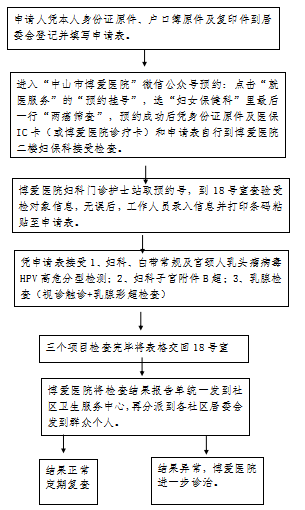 2、进入“中山市博爱医院”微信公众号预约:点击“就医服务”的“预约挂号”,选“妇女保健科”里最后一行“两癌筛查”,预约成功后凭身份证原件及医保IC卡(或博爱医院诊疗卡)和申请表自行到博爱医院二楼妇保科接受检查。