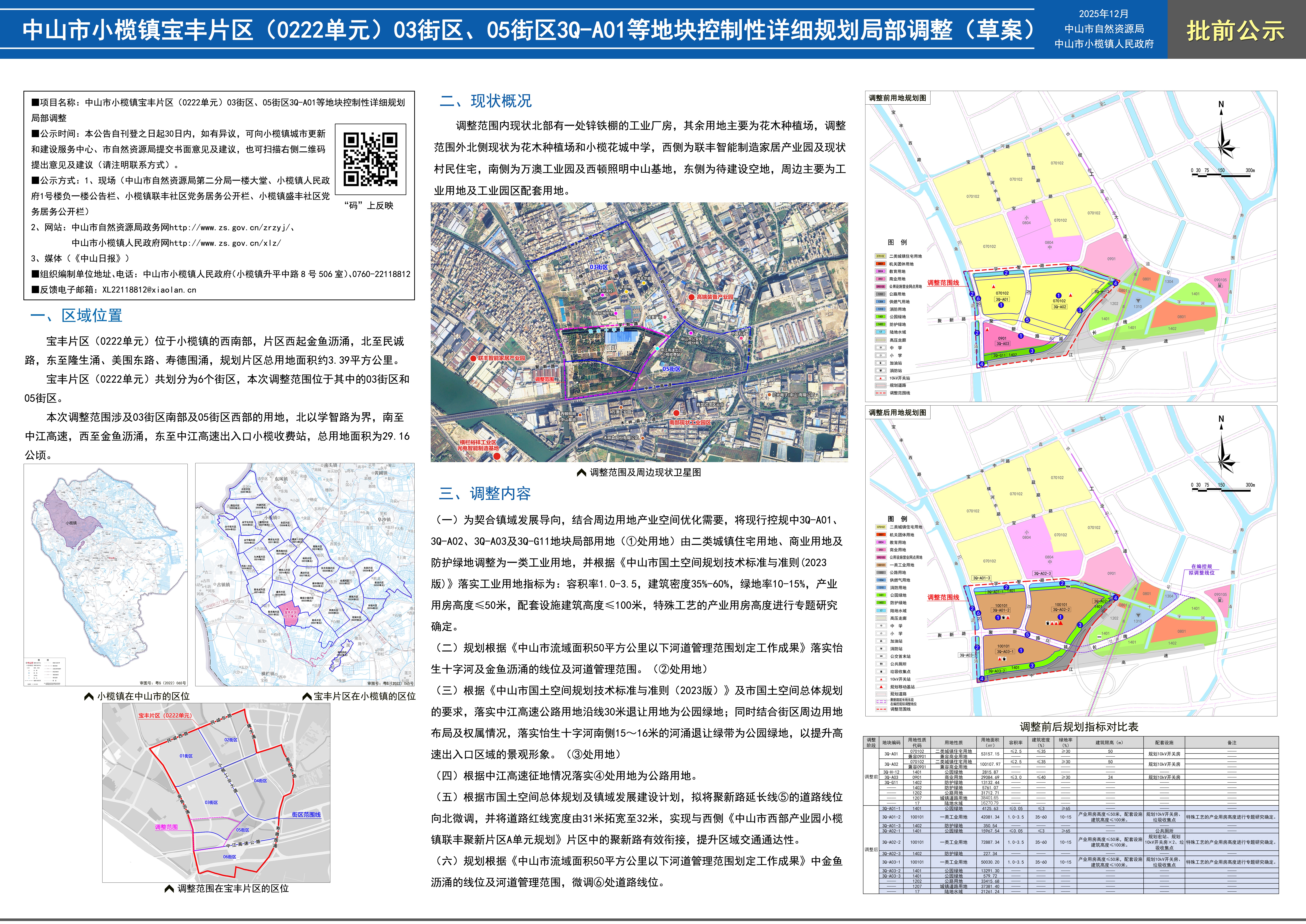 《中山市小榄镇宝丰片区(0222单元)03街区、05街区3Q-A01等地块控制性详细规划局部调整》规划草案编制完成,依据《中华人民共和国城乡规划法》等文件规定,现将规划草案予以公示,广泛征求社会各界意见。