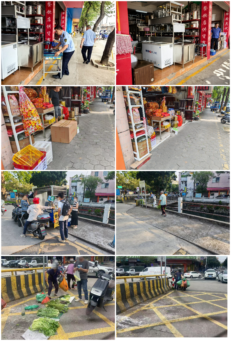 01 成立执法工作站 实现常态化精细管理 为建立长效管理机制,镇综合行政执法局联合新市、东区社区成立文田市场执法工作站。工作站除开展日常整治外,还针对天光墟桥头等交通拥堵节点实施重点管控,在早晚高峰时段安排专人驻岗疏导,规范经营秩序、保障道路畅通。 今年以来,累计教育劝离无照流动经营172宗,纠正占道经营和摆放行为139宗,依法暂扣电子秤6台等违规经营物品一批。 02 强化部门联动 开展联合执法攻坚 副镇长杨志凌牵头组织有关部门召开工作会议,剖析文田市场、东区市场周边存在的突出问题,明确各部门工作职责,要求强化联动、形成监管合力。 镇综合行政执法局、市场监督管理分局、交警大队及属地社区组成专项执法小组,每周至少1次开展联合整治行动。行动中,部门各司其职:综合行政执法局重点整治市场周边商铺占道经营及流动摊贩;市场监督管理分局严查食品安全及商户证照;交警大队依法查处违停车辆;社区工作人员配合开展劝导与协调。 ▲占道经营整治前后对比(左图为整治前,右图为整治后) ▲依法查处违停车辆 自今年4月下旬以来,已开展联合行动3次,累计查处占道经营等违章行为13宗,整治违停车辆27辆,检查鲜肉铺9家、五金店铺5家,市场周边秩序得到显著改善。 03 加强宣传引导 压实“门前三包”责任 坚持执法与教育并重,结合步行执法模式,通过向商户发放“门前三包”宣传单张的方式,加强宣传教育。针对巡查中发现的违规行为,执法人员现场责令立行立改,并通过“回头看”机制确保整改到位,推动商户从“被动管理”向“主动履责”转变,形成共建共治共享的良好氛围。