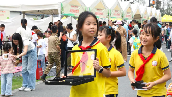 在菊娃公益集市,由镇内多家中小学特色手工社团、红领巾亲子义工家庭组成的公益摊位开展义卖活动。华晖学校20多名学生在老师的指导下,用一周时间制作了一批掐丝珐琅工艺手工摆件,在传播公益理念的同时,传扬非遗文化。