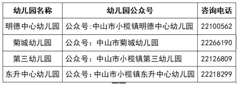 小榄镇2026年镇属幼儿园招生通告 根据《幼儿园工作规程》《幼儿园管理条例》《中山市教育和体育局关于做好2026年幼儿园招生工作的通知》等有关规定,为进一步规范我镇镇属幼儿园的招生工作,经研究,制定2026年镇属幼儿园招生方案,现将有关事项予以通告。 一、招生对象 身心健康,能适应幼儿园集体生活的适龄幼儿。 (一)年龄要求 1.小班:3周岁(2022年9月1日至2023年8月31日期间出生); 2.大班:5周岁(2020年9月1日至2021年8月31日期间出生)。 (二)户籍类别 1.户籍生:小榄镇户籍的适龄幼儿(孩子入户时间截至2026年4月24日); 2.户籍人员子女生:小榄镇户籍人员的适龄子女(孩子监护人一方或双方是小榄镇户籍,孩子非小榄镇户籍); 3.非本镇户籍生:父母及孩子均非小榄镇户籍的适龄幼儿。 二、招生计划 三、收费说明 幼儿园保教费依据发改收费【2023】299号文件规定,按实收取。明德中心幼儿园参照广东省一级幼儿园收费标准,菊城幼儿园、第三幼儿园参照中山市示范性幼儿园(相当于原省一级)收费标准,东升中心幼儿园参照中山市一级幼儿园收费标准。 四、报名办法 (一)报名时间 2026年4月20-24日,每日9:00-18:00。 (二)报名方式 1.符合各类政策性照顾条件的人员子女名单,由上级相关部门以正式公函方式确定,镇委宣传和教体文旅办公室将根据名单在四所镇属幼儿园中统筹安排,无需线上报名。 2.适龄幼儿采用线上报名,每名幼儿只能选择明德中心幼儿园、菊城幼儿园、第三幼儿园和东升中心幼儿园其中一所报名,不得重复报名。 (三)报名程序 1.家长在4月20-24日期间扫码登录“小榄镇2026年镇属幼儿园入学报名”平台,按要求填写并上传相关资料(儿童免疫接种登记表及儿童保健手册待录取后注册时补交); 2.家长根据报名平台指引,在线上传幼儿、家长户口簿 (首页和本人页)及幼儿出生证,孩子和监护人双方均非中山市户籍的,必须增加上传属地小榄镇有效期内居住证。待录取后注册时带原件到幼儿园校对办理注册手续。如发现提交虚假资料,将取消录取资格; 3.报名后请适时再登录报名平台,密切关注审核状态,一旦审核通过不可以修改,若审核不通过的请及时按系统提示原因修改报名信息或资料照片,报名截止后仍审核不通过,未修改的,视为放弃。 五、录取办法 (一)符合各类政策性照顾入学对象的适龄幼儿按相关文件要求优先录取。 (二)幼儿报名资格审查通过后,“小榄发布”微信公众号和各幼儿园微信公众号将公示符合报名条件的名单。 (三)按户籍类别分批录取,第一批户籍生,第二批户籍人员子女生,第三批父母及孩子非本镇户籍生。同一幼儿园,第一批录取后如有剩余学位,再面向第二批招生,第二批录取后仍有剩余学位,继续面向第三批招生。同一批次的报名人数超过剩余学位数时,委托公证处电脑派位录取,电脑派位时间另行通知。 (四)电脑派位结束后,“小榄发布”微信公众号及各幼儿园微信公众号将公布录取名单。 (五)家长到被录取的幼儿园领取“新生录取通知书”,按要求带齐资料在规定的时间内办理注册手续,逾期未注册视为自动放弃学位。 六、其他 (一)本方案解释权归小榄镇委宣传和教体文旅办公室。 (二)招生咨询电话:22233993(小榄镇教育和体育事务中心) (三)招生监督电话:22118819(小榄镇宣传教体文旅线纪委) 附件: 1.2026年镇属幼儿园报名二维码 2.镇属幼儿园公众号及招生咨询电话 小榄镇委宣传和教体文旅办公室 2026年4月16日 附件1 2026年镇属幼儿园报名二维码 附件2 镇属幼儿园公众号及招生咨询电话