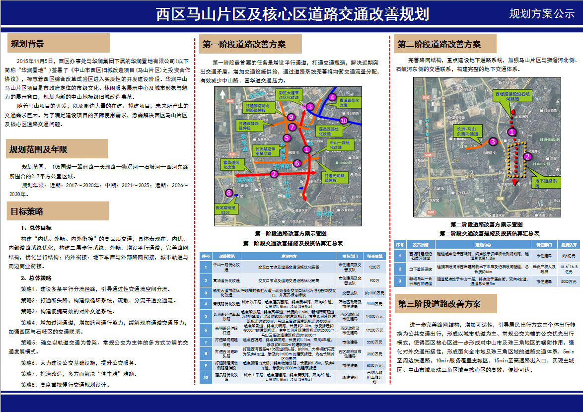 根据《中华人民共和国城乡规划法》等法律、法规有关规定,现将《西区马山片区及核心区道路交通改善规划》进行网站公示和定点公示。本公示自刊登之日起7日内,广大市民或与之存在相关利害关系的单位、组织可到西区办事处行政服务中心或登录西区办事处网站(http://www.zs.gov.cn:87/xq)查阅规划情况,欢迎广大市民来函来电提出宝贵意见和建议。