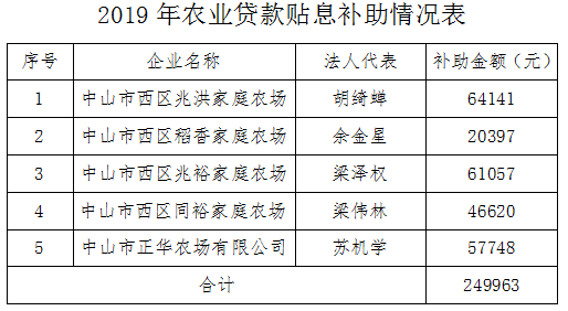 根据《关于印发<中山市西区发展新型农业经营主体认定及专项资金管理实施方案>的通知》(西办[2016]98号)文件精神,现将2019年农业贷款贴息补助情况公示如下,公示时间自2019年11月6日至2019年11月13日,对下列补助对象有异议者,请书面和电话向我局反映。