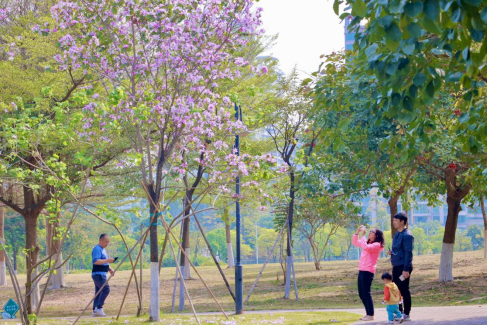 In Torch Development Zone's Deneng Lake Park, Bauhinia variegata is in full bloom, delighting the eyes of tourists immersed in the beauty of spring.