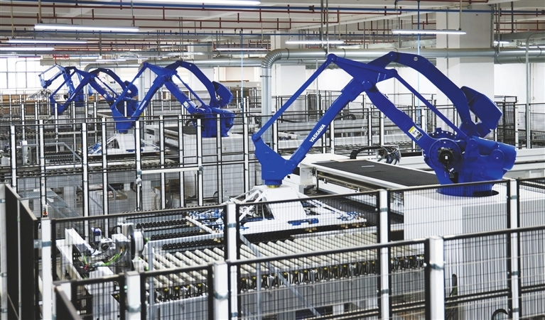On May 23, in the newest digital workshop of the listed company Topstrong, the machining center and robots were working in concert. The cutting, edge sealing, packing and other procedures of custom-made panel furniture were automatically completed in the workshop.