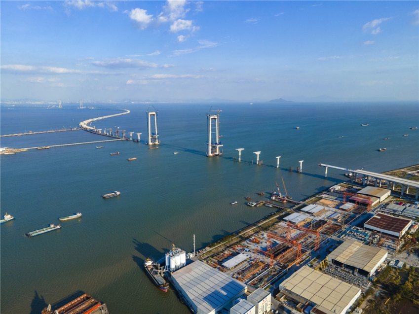 The Shenzhen-Zhongshan Bridge connects the two cities. It extends from the Hezhou Interchange in Bao'an District, Shenzhen in the east to the Hengmen Pivot in Zhongshan in the west, with a total length of 24 kilometers. This photo shows the under-construction Shenzhen-Zhongshan Bridge.