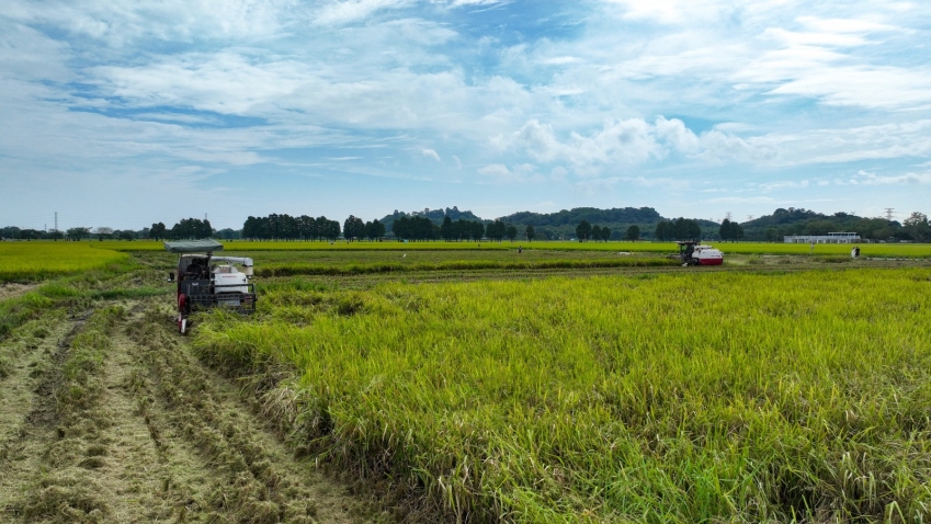 Two harvesters are moving back and forth in the rice fields, reaping and threshing the rice in one smooth motion. (Photo by Liang Junbang)