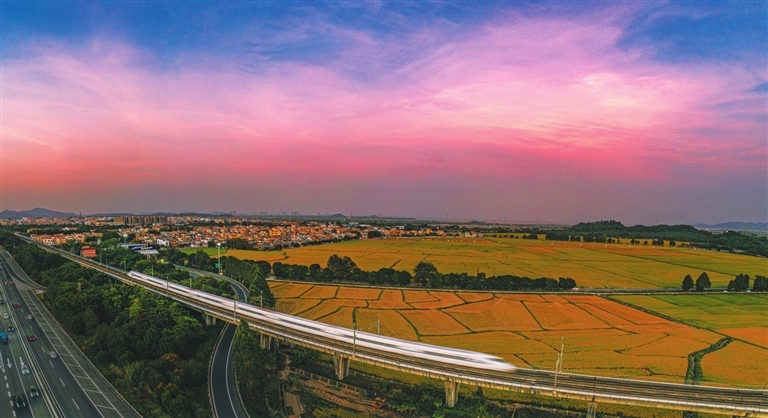 October 25, 2022. The complimenting glow of sunset and rice paddies in Yakou Village, Nanlang District. [Photo by Li Yan]