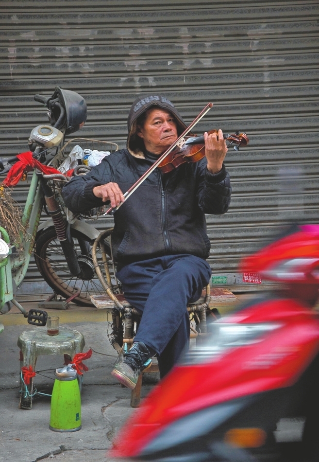 On January 16, 2023, an old man playing the violin was immersed in his musical world outside Nankeng Market. (Photo/Chen Junhao)