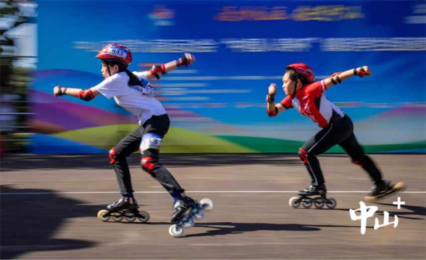 Chase (Third prize): On July 8, in the scorching sun, student athletes competed in the speed roller skating competition at the 9th Games of Zhongshan. (By Li Jing)