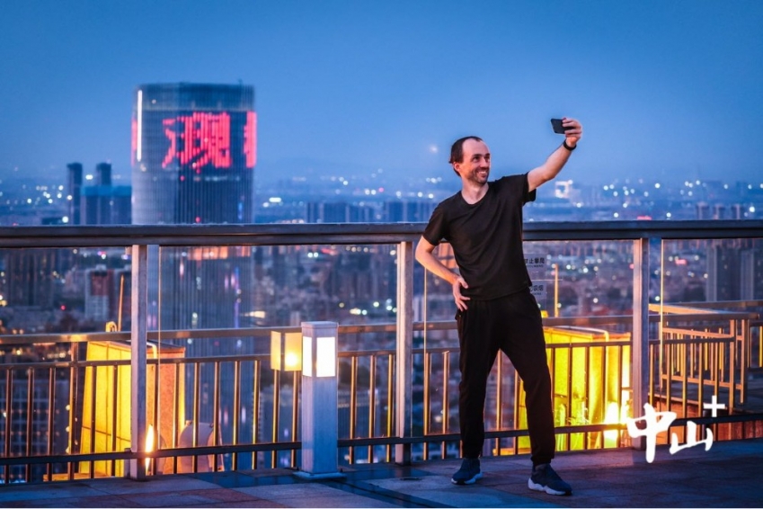 Pleasant View (Third prize): April 25, a foreign friend is happily taking selfies on the rooftop of Lihe Plaza. (By: Kai Qiang)